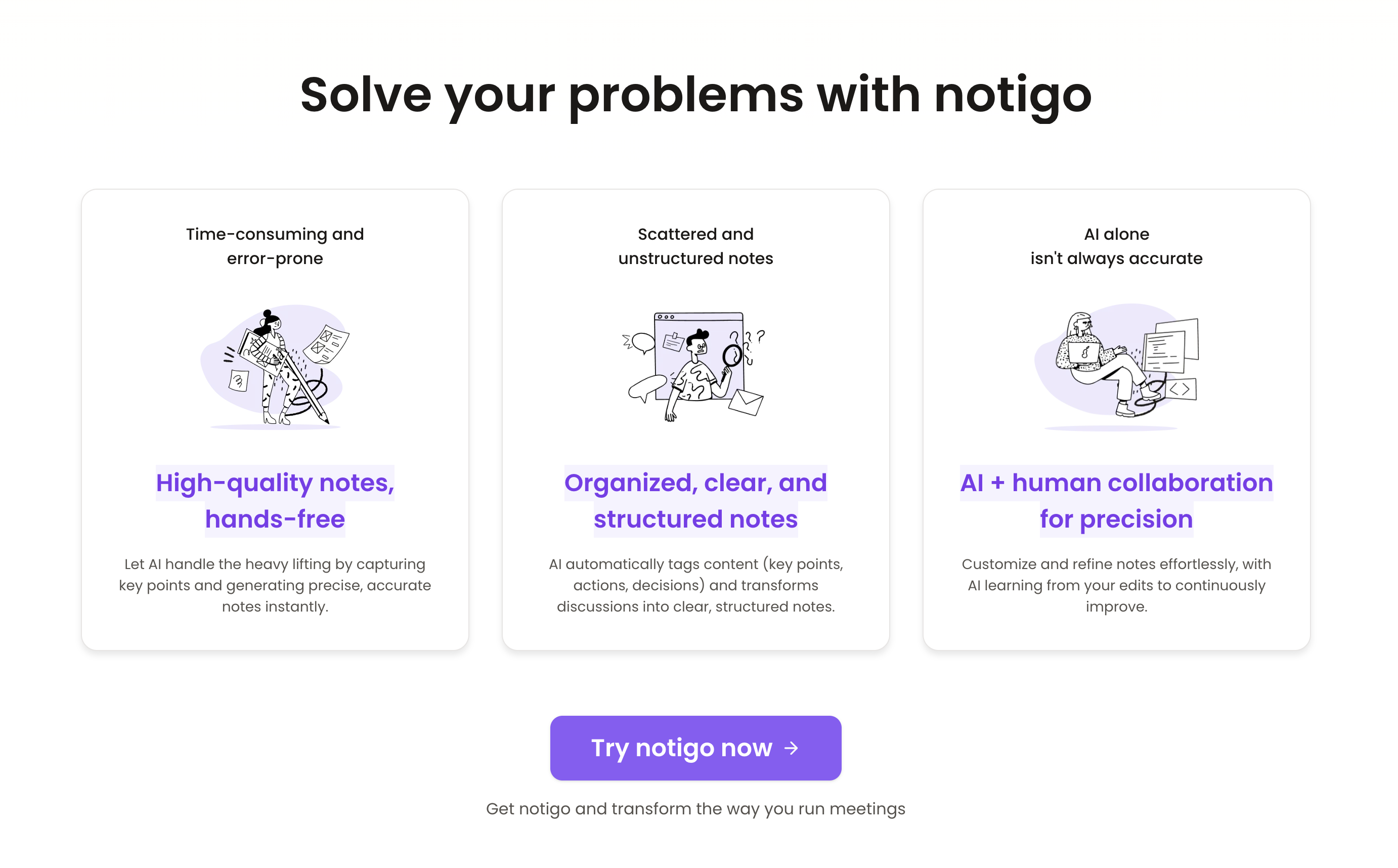Are you drowning in meetings? Do you spend more time scheduling and summarizing discussions than actually making progress? In today's fast-paced business environment, inefficient meetings are a silent productivity killer. Hours are wasted on back-and-forth emails to find a time that works, and valuable insights are often lost in the shuffle of note-taking. We've all been there – stuck in a meeting that could have been an email, or struggling to recall key decisions made in a previous discussion. These inefficiencies don't just cost time; they impact morale, slow down projects, and ultimately, affect the bottom line. Notigo.ai is designed to address these pain points directly. As the best meeting scheduling tool and automated note-taking solution, This article will explore how AI is fundamentally changing the way we approach meetings, providing practical insights into how Notigo can boost your team's productivity and unlock the true potential of your discussions. We'll delve into the specific challenges that plague modern meetings and demonstrate how Notigo's features can solve them, step by step.